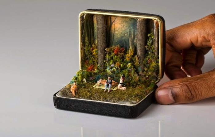В руках канадского художника антикварные коробочки превращаются в миниатюрные театры, где порой разворачиваются реальные сцены из жизни. Сюжеты диорам не слишком замысловатые, однако они выполнены очень трогательно и с душой.