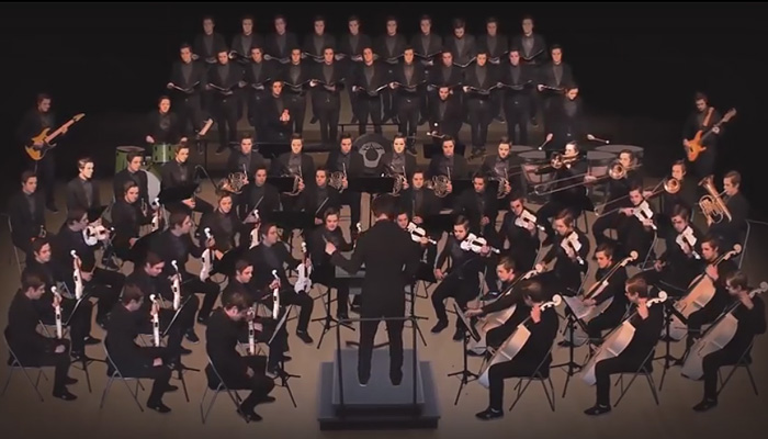 Молодой музыкант Бен Мофитт (Ben Morfitt) собрал сложнейший ролик, где 70 его копий играют в одном оркестре. Все партии были сняты в его спальне, на фоне зеленой драпировки. Результат получился впечатляющим!