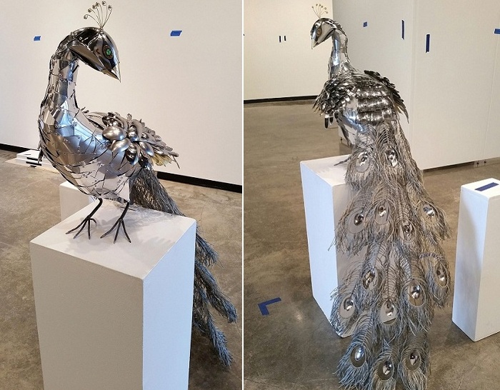 Как известно, фантазия границ не имеет. Особенно если мастером является студент, полный идей, но лимитированный финансово. Так талантливая девушка создала потрясающую скульптуру павлина из обычных ложек, ножей и прочих столовых приборов. К слову сказать, что общая стоимость этих предметов составила не более $ 50.