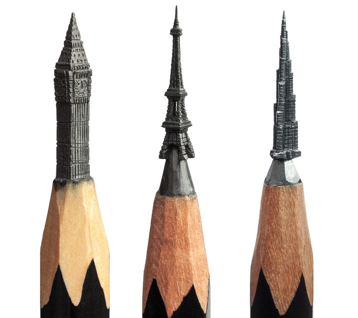 Российский художник из Уфы Салават Фидай выбрал для себя в качестве любимого занятия миниатюру. Он вырезает из карандашных грифелей разнообразные фигурки памятников архитектуры, мультяшных героев и многое другое.
